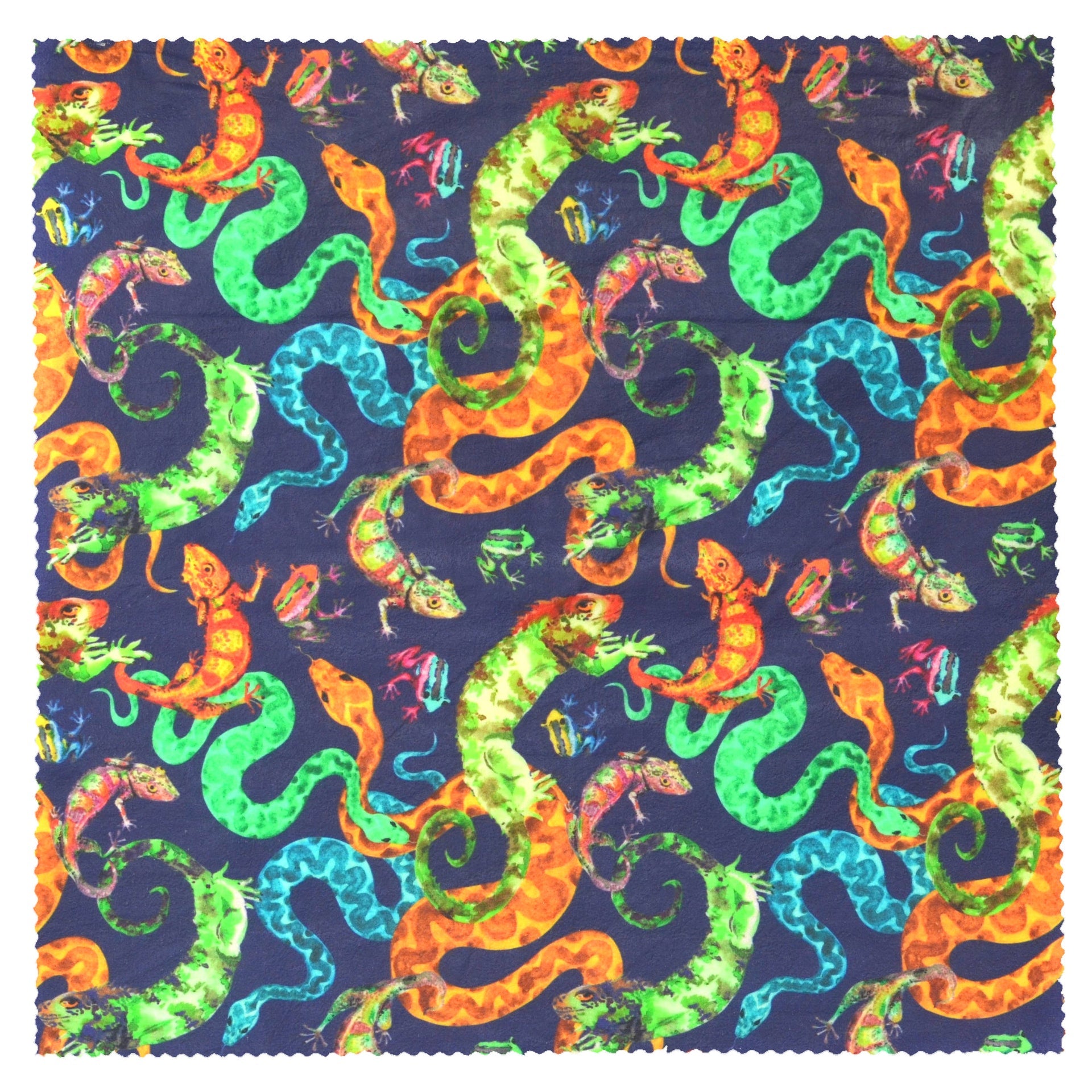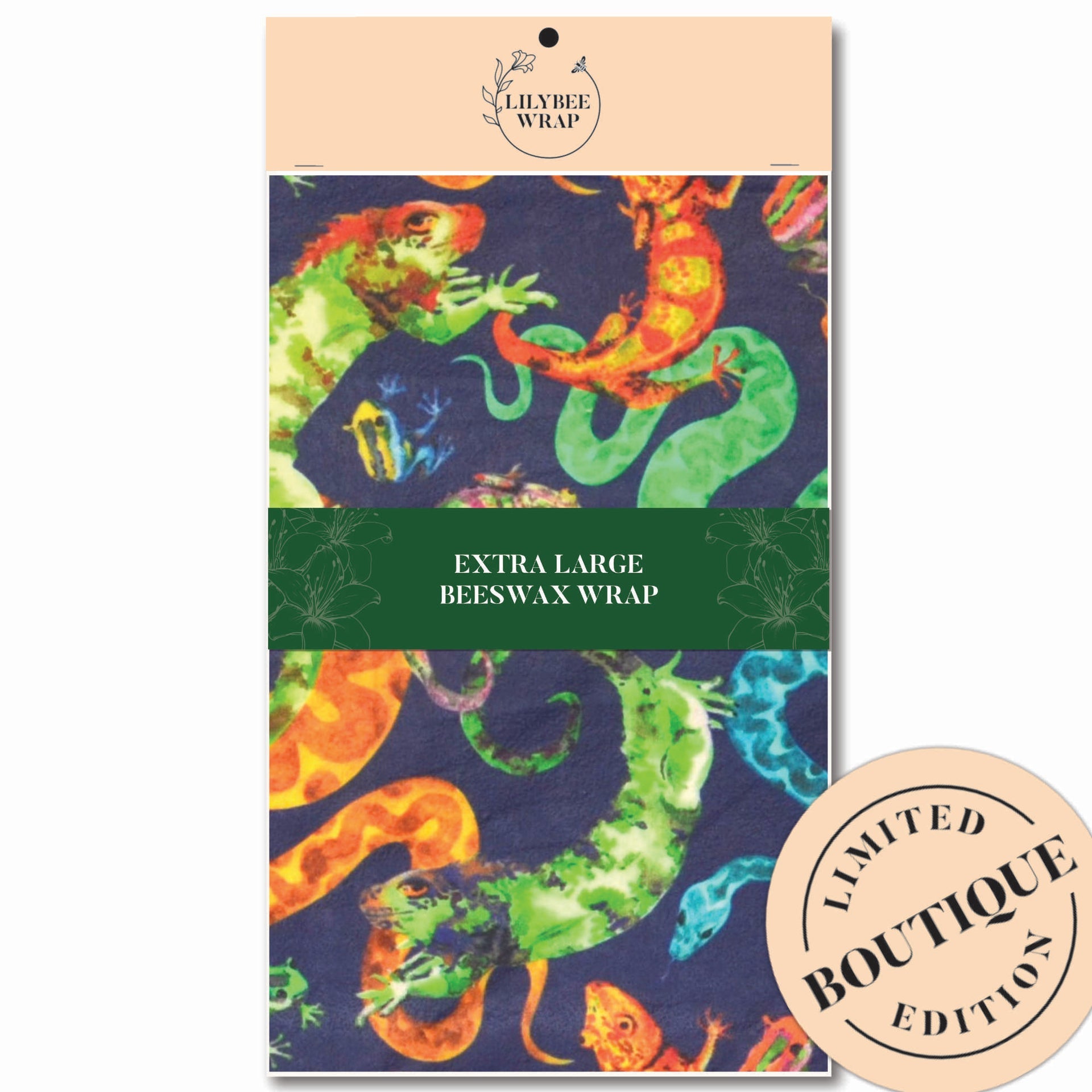 Chameleons, iguanas, frogs and snakes all dressed in their best carouse over this beautifully off-beat beeswax wrap.