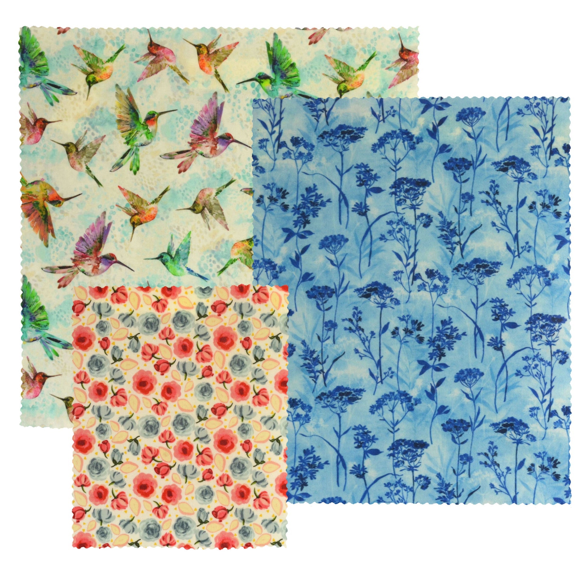 Bring a touch of gentle beauty to your kitchen with Hummingbird Harmony, a set of three beeswax wraps inspired by nature’s most delicate flyers. The large wrap features hummingbirds in mid-flight, their feathers a soft rainbow of jewel tones — a peaceful, uplifting scene that feels like a quiet garden moment. The medium wrap offers a lovely contrast with its classic blue floral design, while the small wrap is sweet and subtle with a scattering of soft-coloured blossoms.