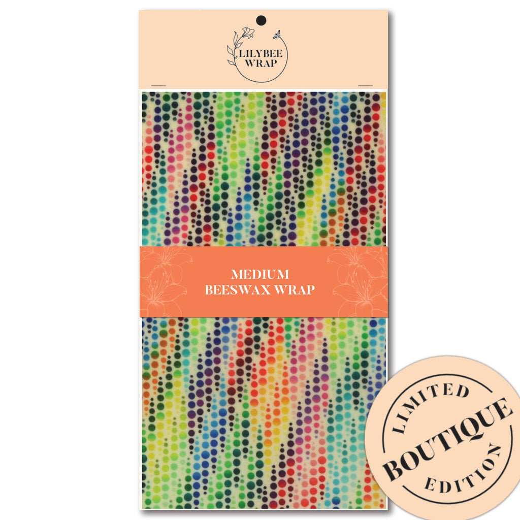 Rainbow streams of colour shower this beeswax wrap, adding bright energy to your kitchen.