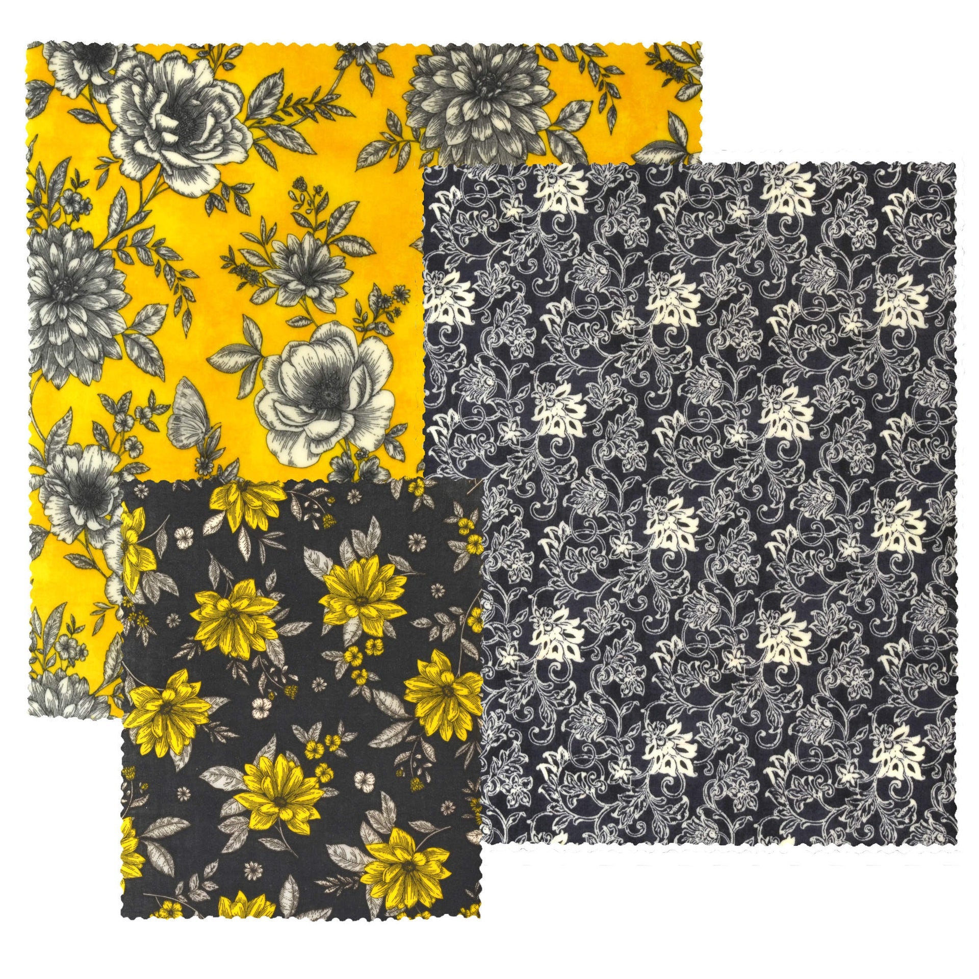 Introducing our "Black and Gold" Beeswax Wrap Set – a trio of beautiful, reusable wraps featuring a chic floral design in black, yellow (gold), and white. Perfect for adding a touch of elegance to your kitchen, these wraps keep your food fresh while reducing single-use plastics. With their bold, stylish colors, these Black and Gold wraps are as functional as they are fashionable, making them a must-have for any eco-conscious kitchen!