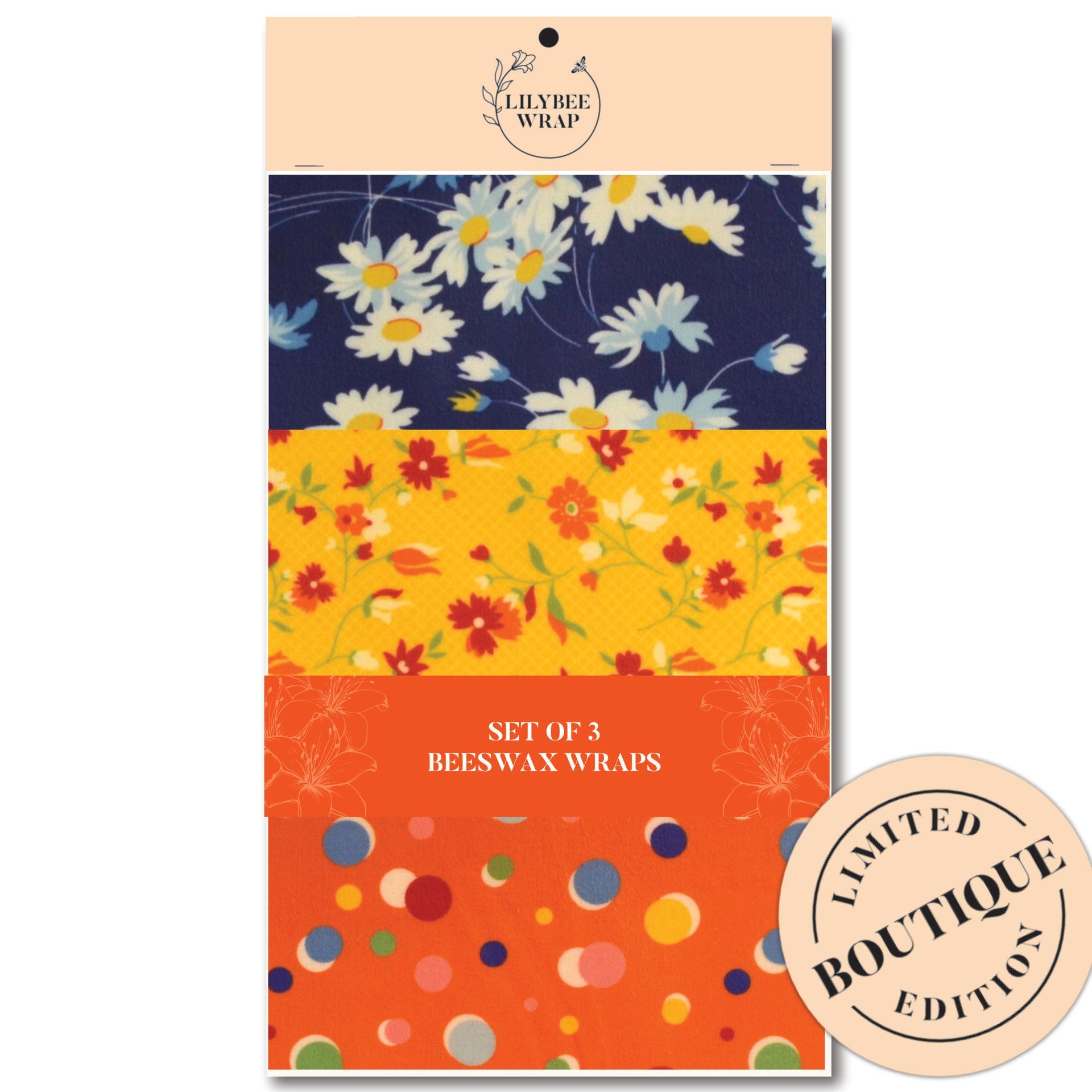 Say hello to sunshine in your kitchen! This vibrant set of three beeswax wraps is bursting with colour and joy — perfect for adding a little extra brightness to your everyday. The large wrap features crisp white daisies scattered across a royal blue background, bringing bold contrast and a classic floral touch. The medium wrap pops with tiny blooms on a cheerful yellow base, while the small wrap is a playful splash of orange, dotted with bright, irregular spots for a fun, modern twist.