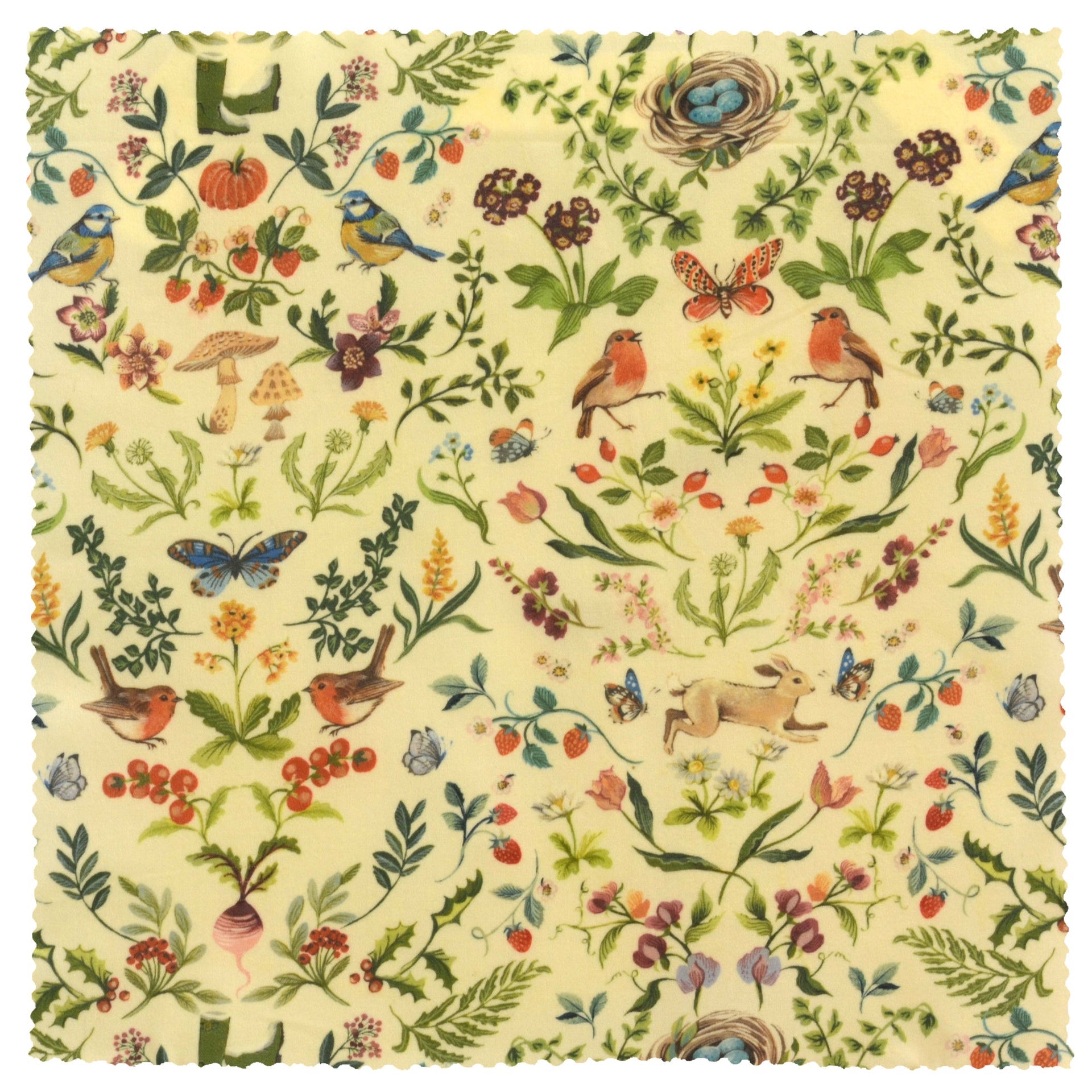 Step into the quiet magic of the forest with Woodsong — a richly illustrated beeswax wrap featuring robin red-breasts, blue tits, brambles, berries, nuts and mushrooms.