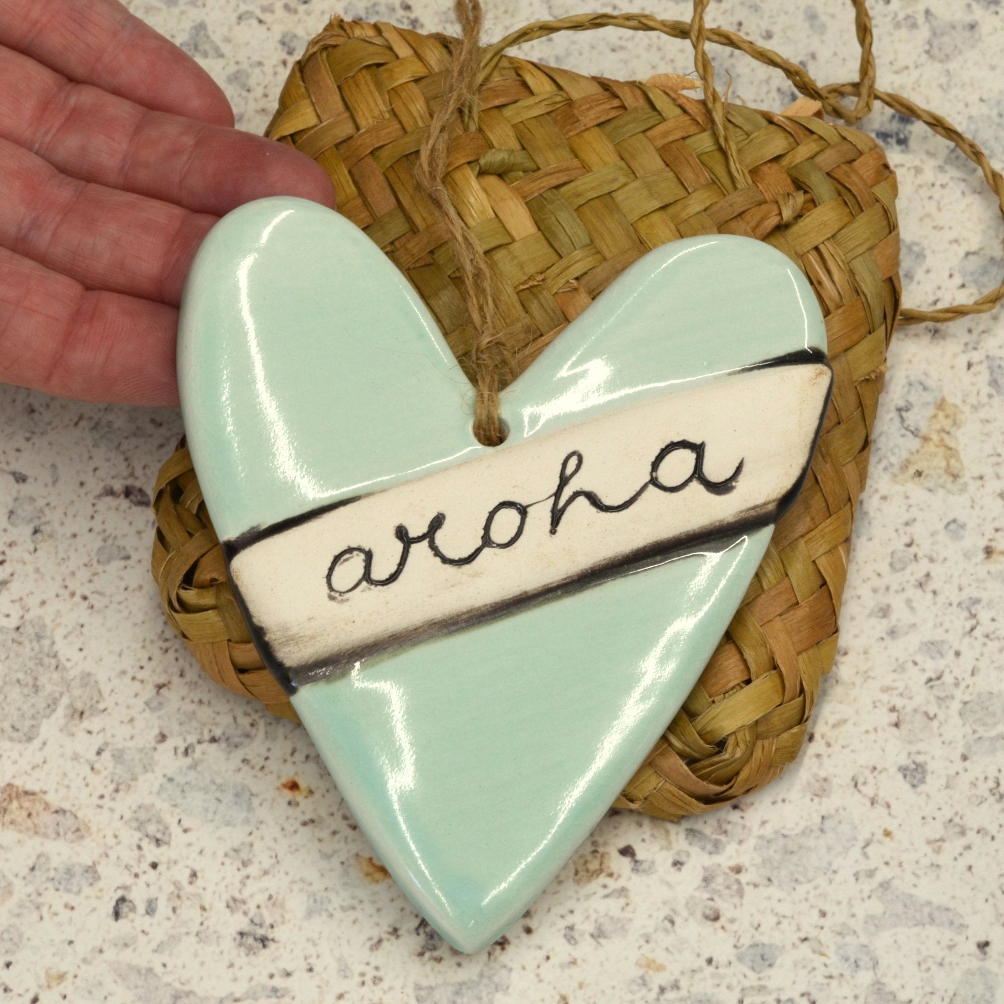 Each ceramic heart tile comes with a woven flax kete - perfect for gift giving.