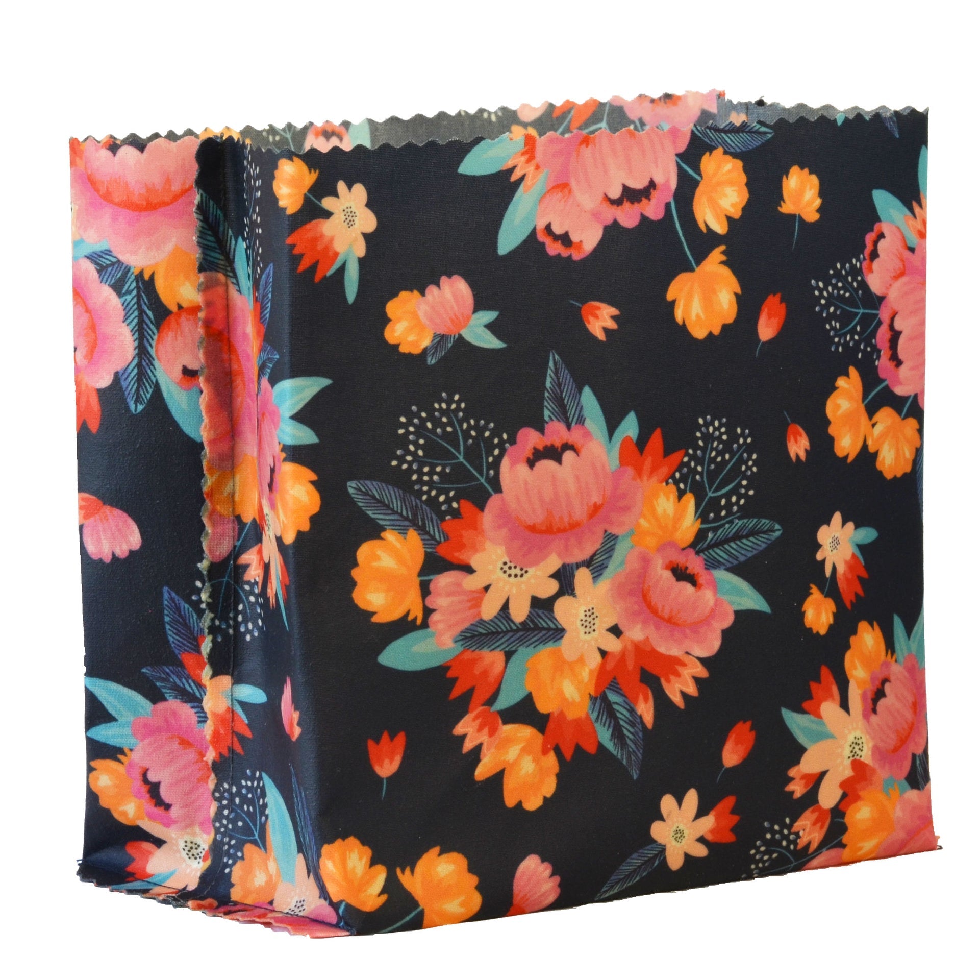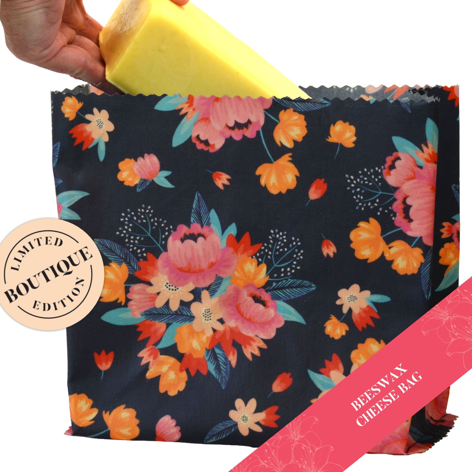Bouquets bursting with bright blooms on a bed of navy blue adorn this Limited Edition cheese bag.   If it is true that we eat first with our eyes, this delicious design is the perfect appetiser.