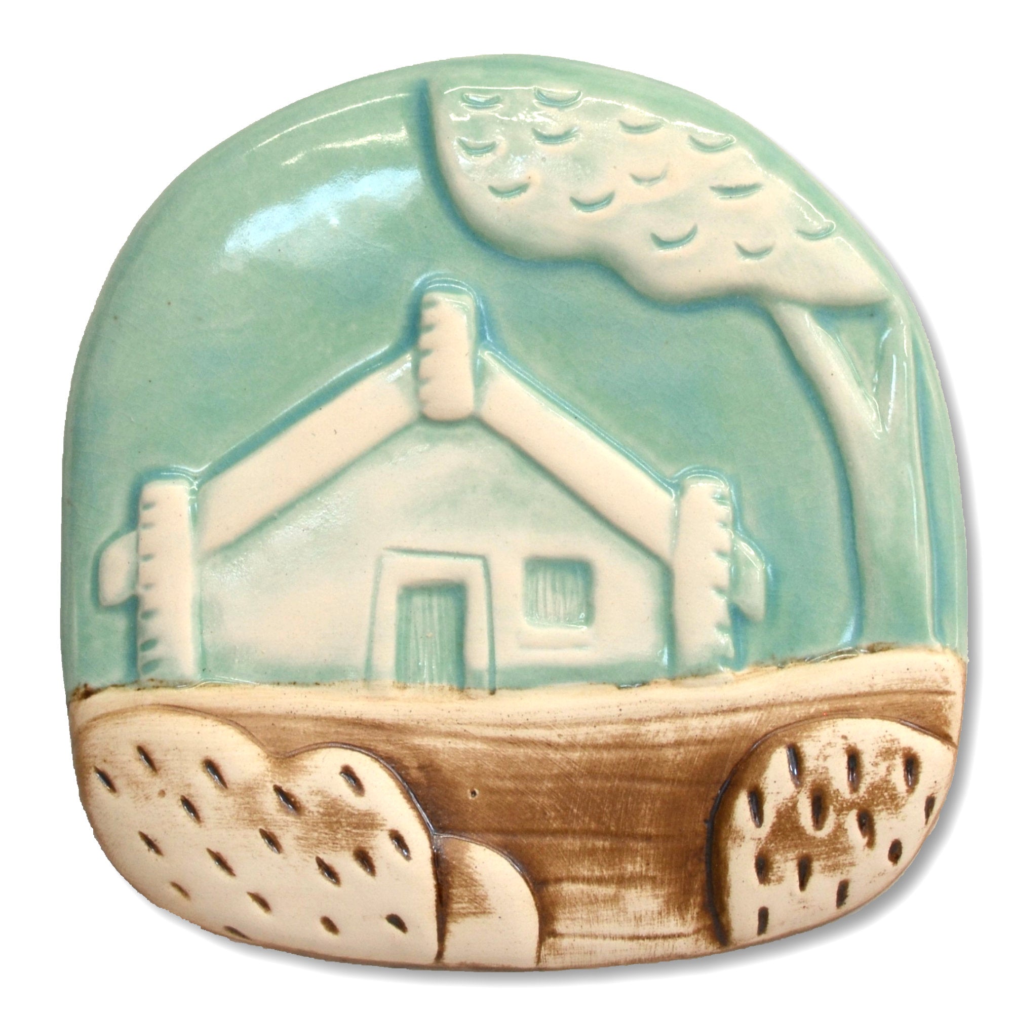 A wire loop is embedded in the back of the piece for hanging.